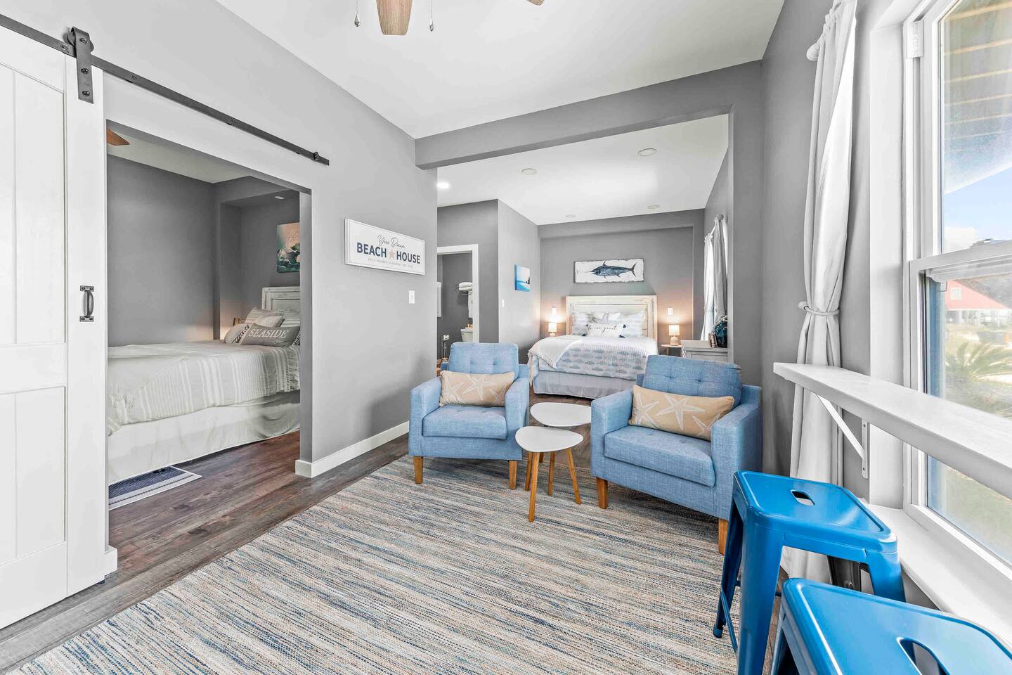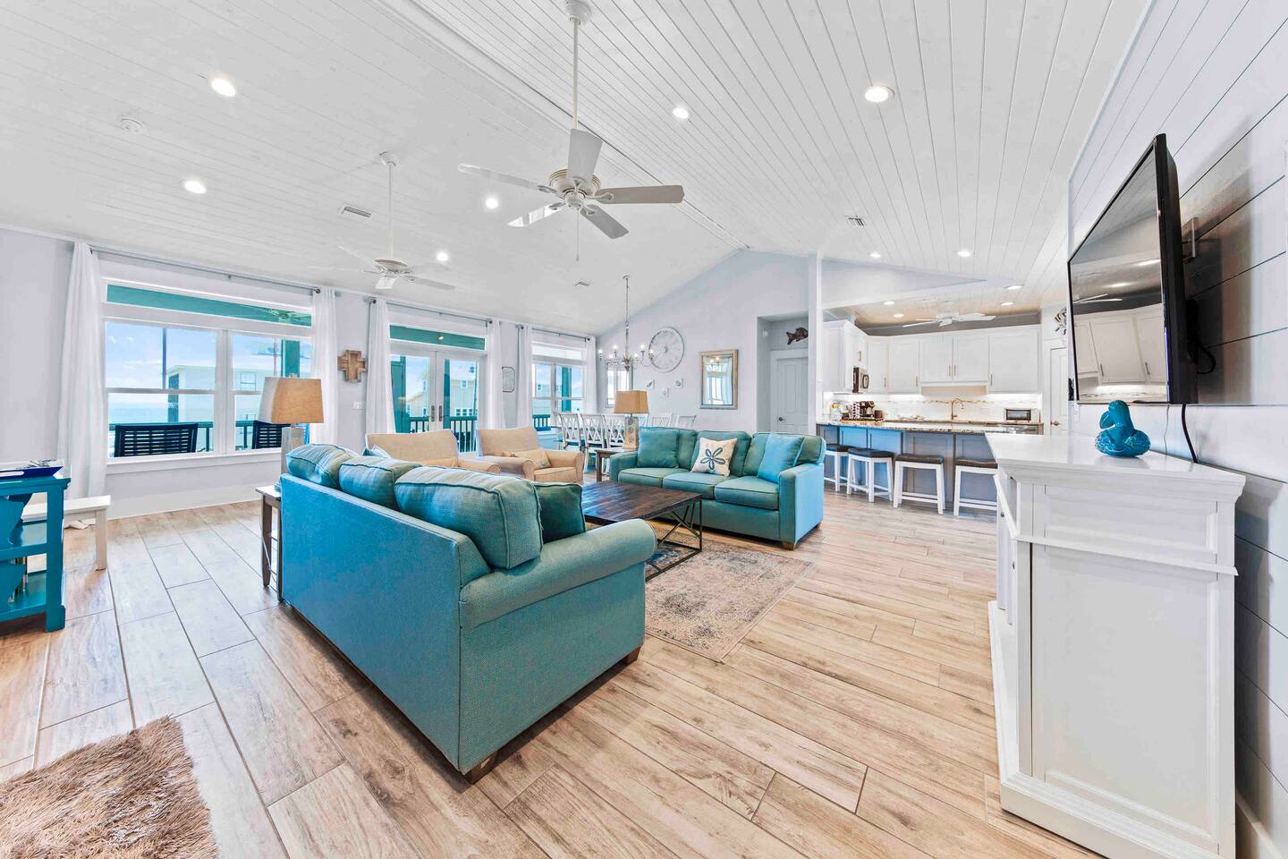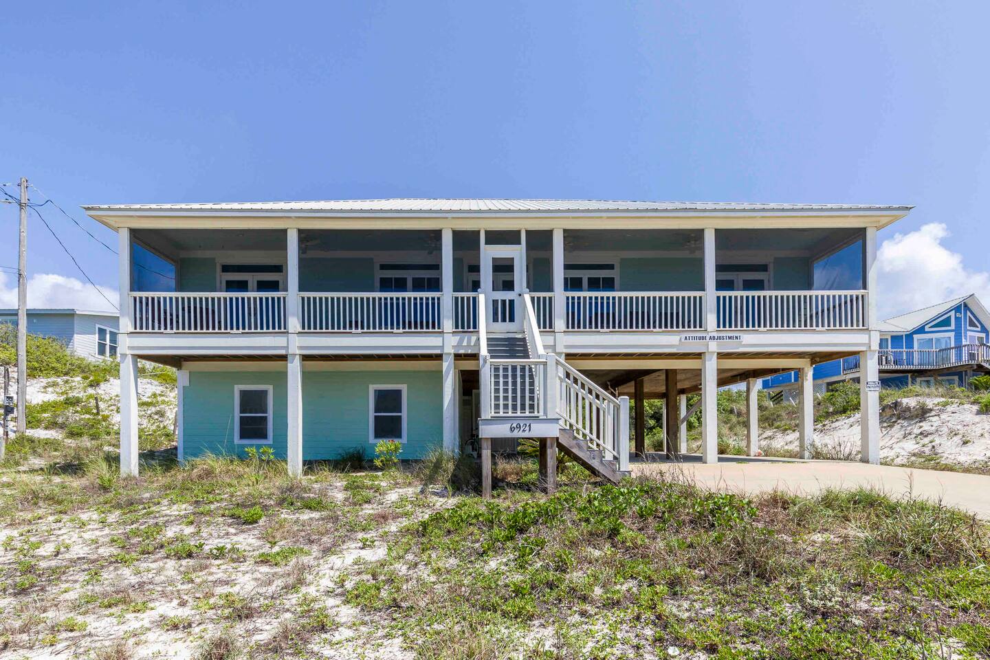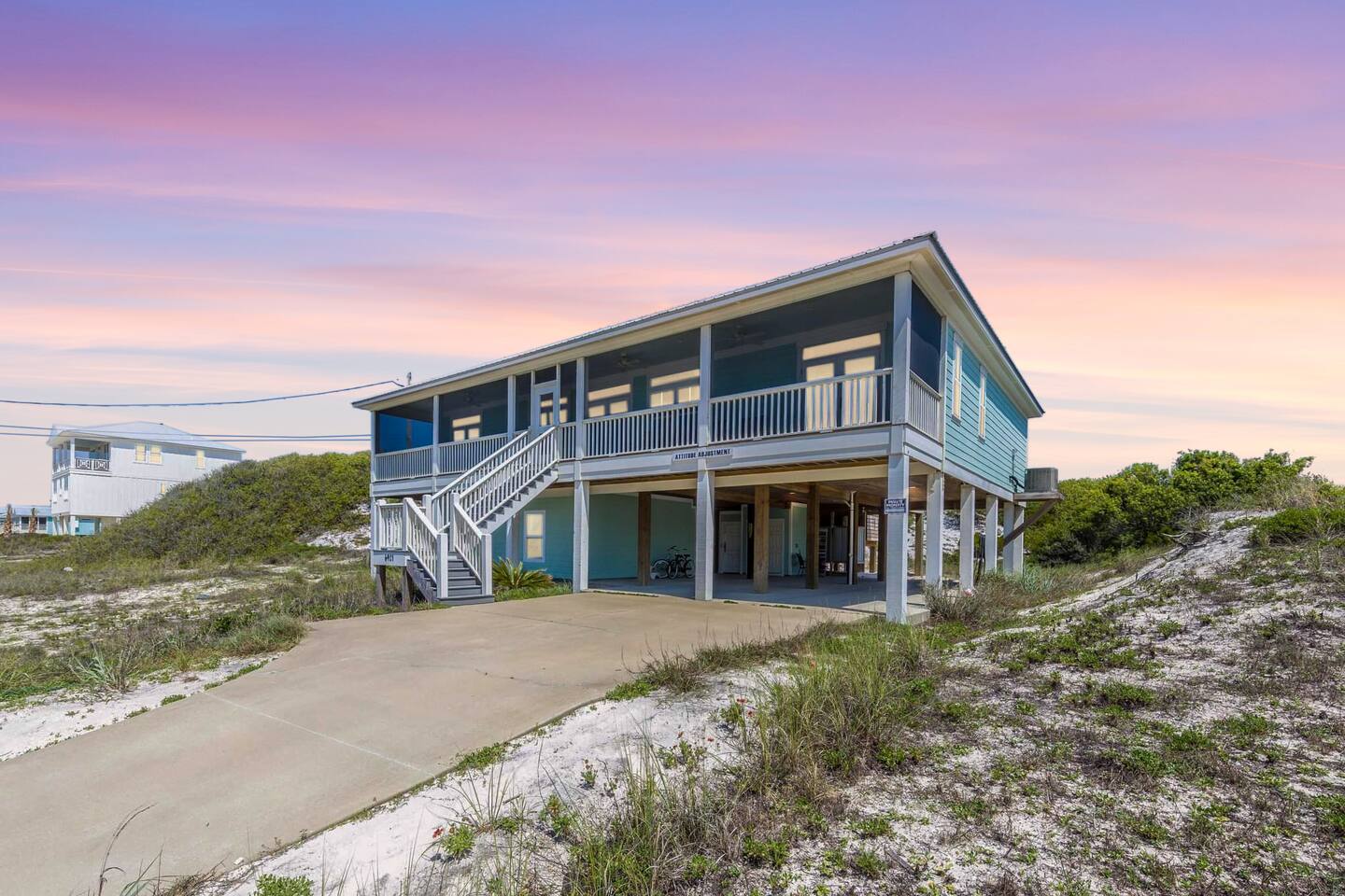 * 1 minute walk to the BEACH access! * Villa sleeps 17 people * Next to Kiva Dunes Golf Course * 2 level home with separate entrances Upstairs includes: ~ 2 master bedrooms with a king bed, en suite bathroom, and TV ~ Bunk room one has 4 singles and TV ~ Bunk room two has 2 fulls and 1 single and TV ~ 3rd Full bathroom with tub ~ Spacious open concept living area with TV room, dining room and kitchen (fully stocked for the cook!) ~ Patio with rocking chairs to relax and listen to the waves ~ Private salt water pool. ~ Pool deck with dining and lounge seating Downstairs (new addition) includes: ~ Large combo room; including a bedroom with a queen size bed and an extra TV lounge area ~ 2nd bedroom with a queen size bed ***These two rooms are separated by a barn door and you have to walk through large room to get to second bedroom ~ Full bath with stand up shower • Fully stocked updated kitchen • Grill and utensils • Coffee set up with Keurig Duo- we supply first day of cups, filters and sugar • We provide a starter pack with dish soap, hand soap, shampoo, lotion, garbage bags, paper towels, toliet paper. For longer stays you may need to restock on your own. • Netflix, Hulu and Disney Plus in all rooms • Onsite washer and dryer • Private onsite parking • Beach towels and blankets • Beach wagon • Elevator may be available upon request.